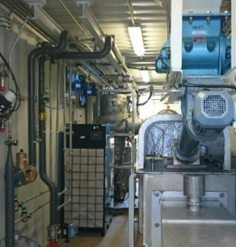 The condensers use cold water, available in the Greenhouse, as cooling/condensing medium. In order to increase the condensation efficiency, a reflux process is used, with an Hydrocarbon Condensate/water separator and a gear pump. The pump will transfer the filtered Hydrocarbon Condensate from the duplex Hydrocarbon Condensate/water separator/filter, back to the top of the condensers, to increase the condensation efficiency. Then the product gas is transferred from production container to the utility container for the further conditioning in step 4 – Post Production.