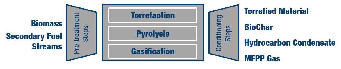 The three processes integrated in the MFPP plant are Torrefaction, Pyrolysis and Gasification. The MFPP installation is set up to fit your desired combination of input options and output needs.